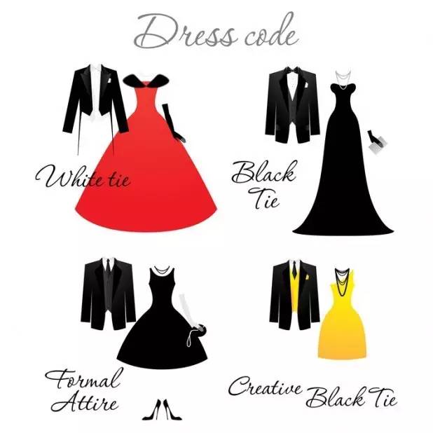 Black tie: 最正式的,通常指宴会,比一般西服更加隆重的黑西服、黑领带、或者领结