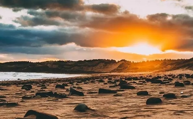 这里拥有深邃的海湾和持续不断的潮汐,温柔包围着形如新月的小岛。岛上宁静的道路、麦浪起伏的农地、如诗如画的小渔村、白色墙面的教堂,以及高耸在海边孤立的岩石上的灯塔都如童话中才出现的景致。而岛上的土地、岩石、甚至沙滩,都是红色的,那红色的细沙一经海水的拍打和浸入,更显出润泽的鲜艳。