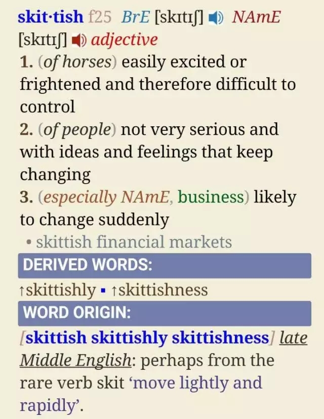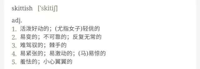 除了读单词例句之外,大量阅读文章,体会单词的使用语境也至关重要。一个单词只有放在语境中才有了生命,在语境中它不再是孤零零的概念,而是一个个鲜活的故事。举个例子,对于前面提到的单词 skittish, 你在牛津词典上会看到这样的解释: