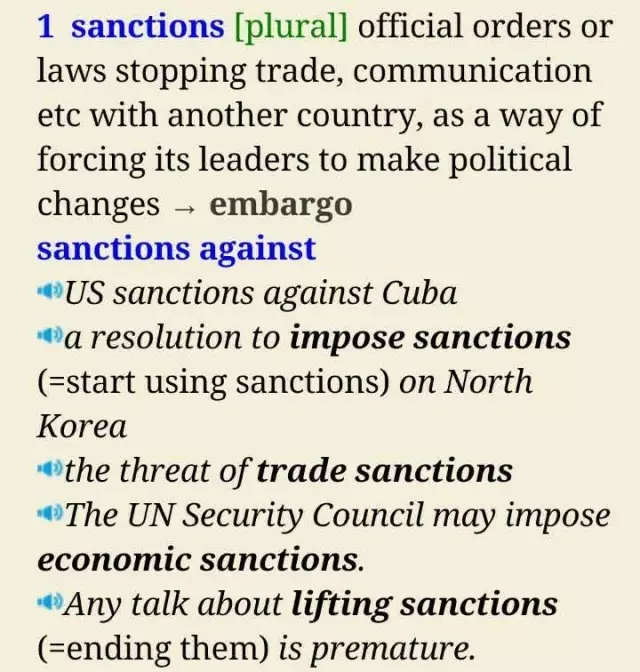通读词典上的例句后我们可以发现,当sanction 表示“制裁”时,一般是指针对某一国家的制裁,多用复数,而且前面的动词搭配一般为 apply, ease, enforce, impose, lift 等,后置介词搭配则一般为against/on,比如 impose/lift sanctions against/on