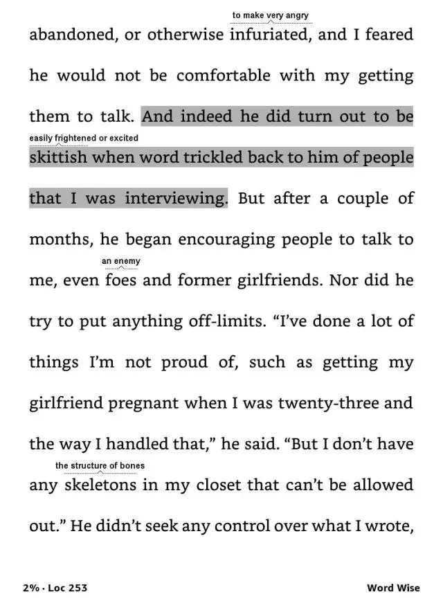 截图中的文章片段来自乔布斯传,任何人看到这里应该都能感受到skittish 这个词用得有多么精准传神,它写出了乔布斯那种桀骜不驯,喜怒无常的状态。将单词和乔布斯这个具体的人物联系起来,要理解它记住它就简单很多。